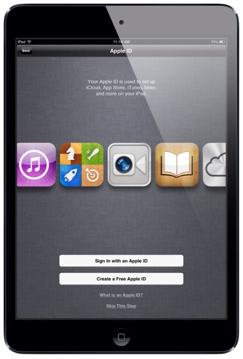 First off, if you don’t have an Apple ID yet, you will need to set one up. A credit card is required (for future iTunes and App store purchases). Once you have your Apple ID, or if you have one from an old iPod/iPhone, enter it in on this screen. (Remember to keep your password safe!)